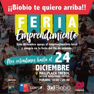 Si aún no has comprado tus regalos de navidad, te contamos que extendimos la Feria de Emprendimiento «Biobío te quiero arriba» hasta el martes 24 de Diciembre! No dejes de apoyar a nuestras pymes y compra a los emprendedores locales!